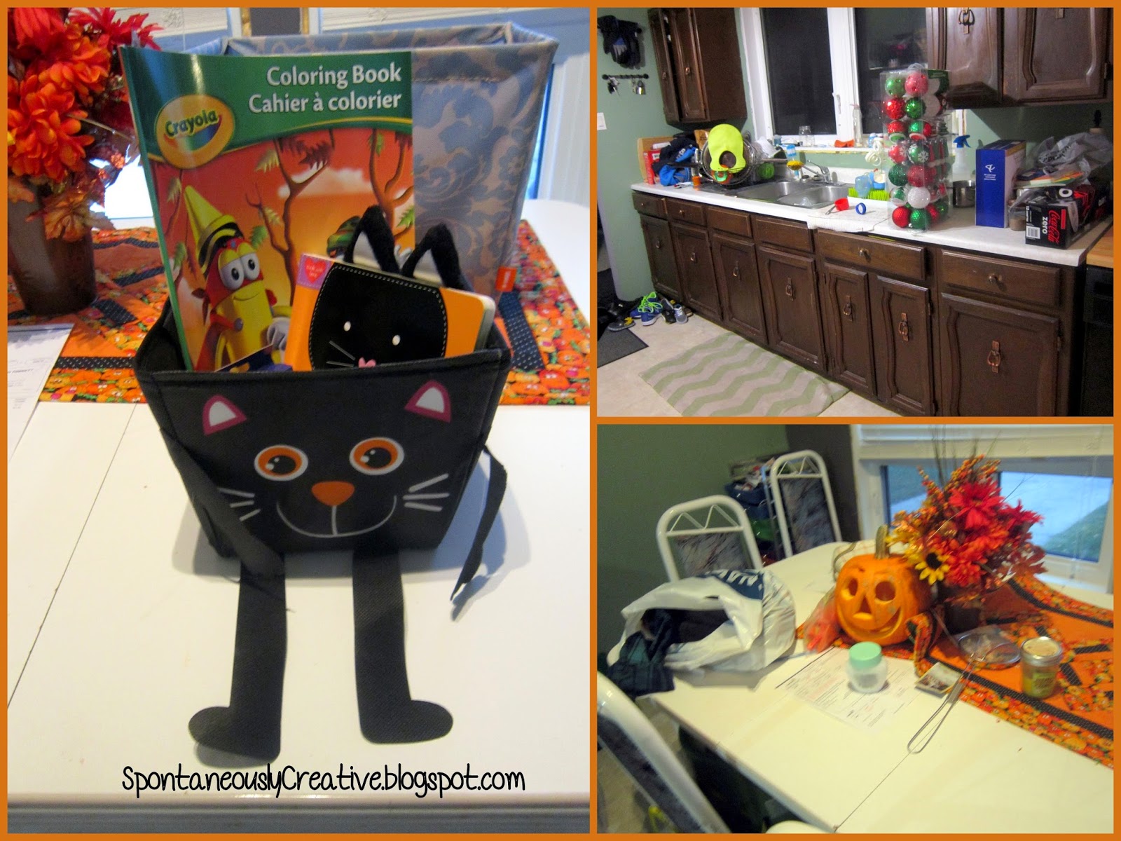 I was a little surprised Roman was still asleep so I decided to get something accomplished while I could. There is one thing that without fail can completely stress me out and make my day miserable. What is this demon you ask? It's a disastrous kitchen! Because our front door is off the kitchen, the counters and table tend to be a catch all for anything and everything. Pre-Roman I would have been appalled that my sink was brimming with dishes, but now, it's just another day. Once I got most of the disaster cleared I thought it was probably a good time to fill Roman's kitty basket with his Halloween goodies. I needed an excuse to buy him a kitty book I found at Wal Mart, so I picked up a coloring book and crayons to go with it. In case you haven't guessed, Roman has a love of all things kitty!